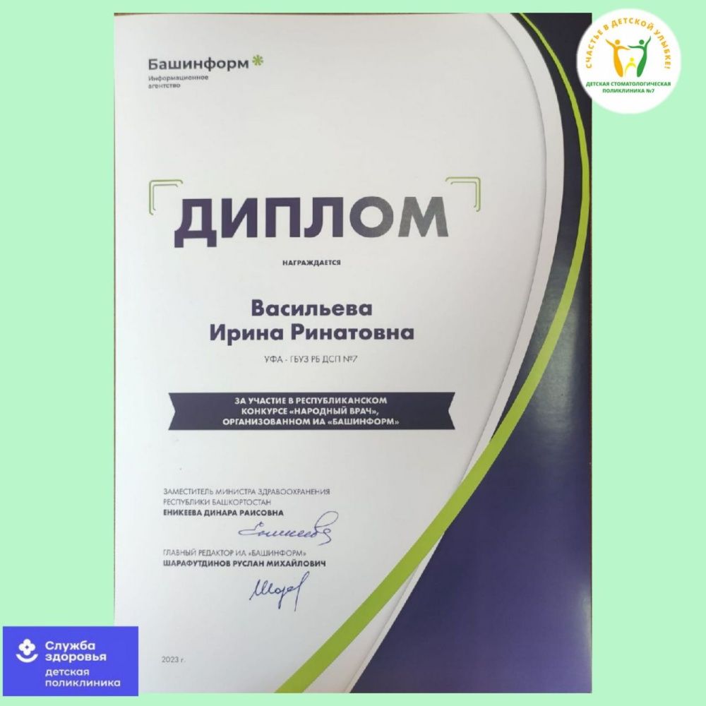 31 августа в стенах ИА "Башинформ" состоялась торжественная церемония чествования участников конкурса "Народный врач", в котором одержала победу врач-стоматолог детский ГБУЗ РБ Детская стоматологическая поликлиника №7 г.Уфа Васильева Ирина Ринатовна.