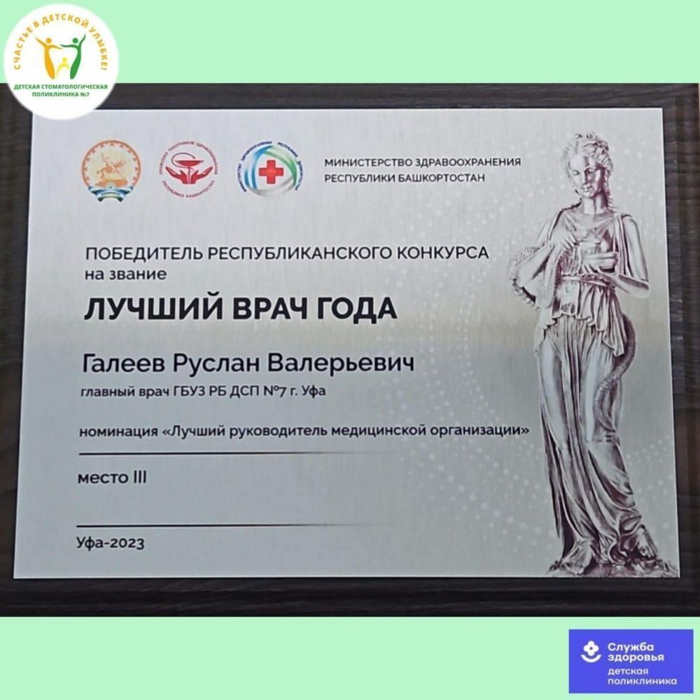В номинации «Лучший руководитель медицинской организации» республиканского этапа конкурса «Лучший врач года 2023» почетное 3 место занял Ваш покорный слуга. Благодарю организаторов конкурса Центр общественного здоровья г. Уфа, Мамаеву А.В. и лично Министра здравоохранения РБ Рахматуллина А.Р. за признание наших профессиональных результатов.