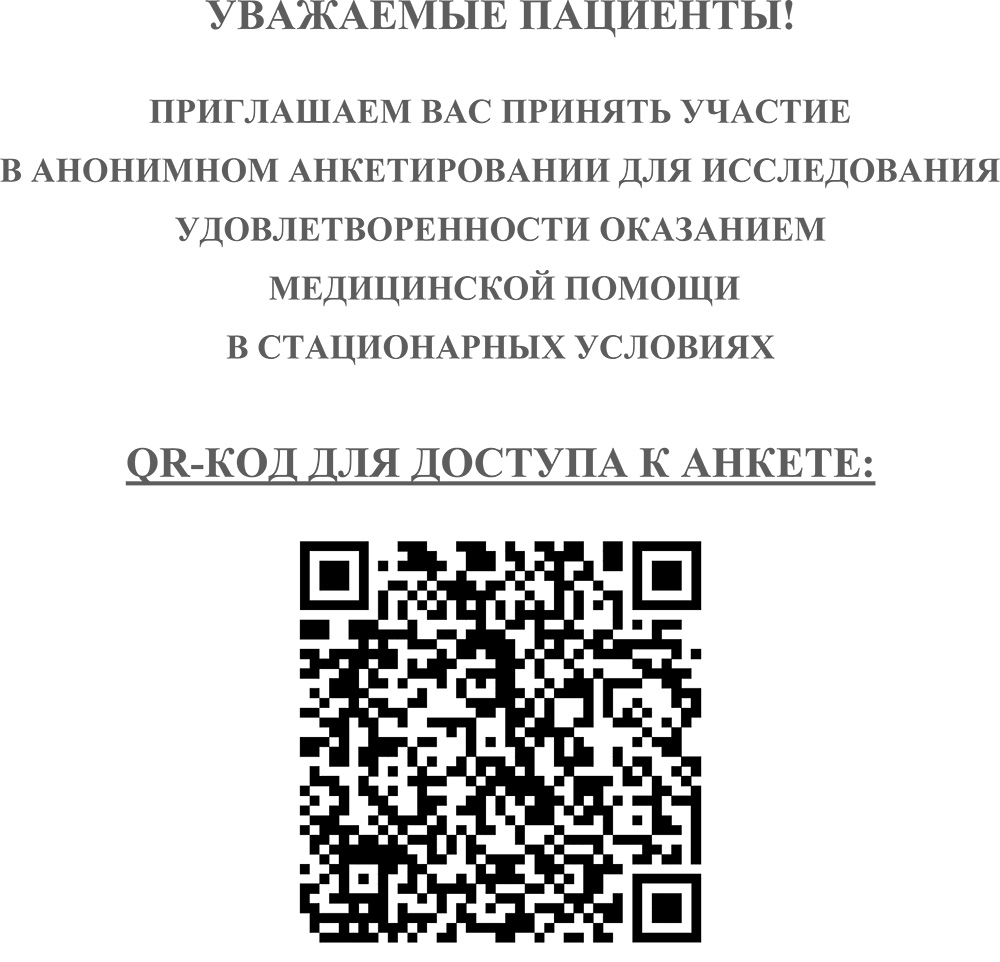 ПРИГЛАШАЕМ ВАС ПРИНЯТЬ УЧАСТИЕ В АНОНИМНОМ АНКЕТИРОВАНИИ ДЛЯ ИССЛЕДОВАНИЯ УДОВЛЕТВОРЕННОСТИ ОКАЗАНИЕМ МЕДИЦИНСКОЙ ПОМОЩИ В СТАЦИОНАРНЫХ УСЛОВИЯХ по ссылке: https://forms.yandex.ru/u/68d4cf744936391f8b5c2e38