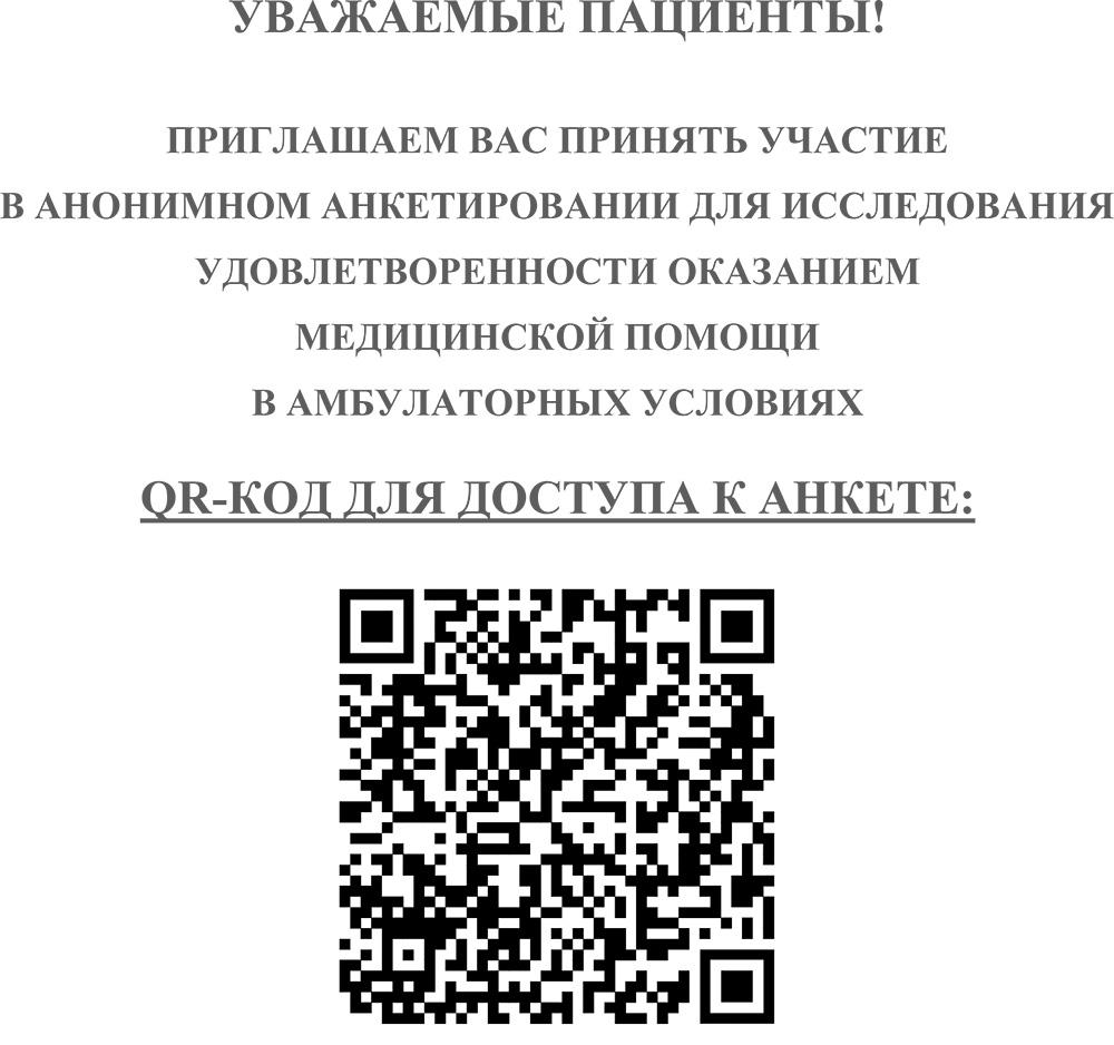 ПРИГЛАШАЕМ ВАС ПРИНЯТЬ УЧАСТИЕ В АНОНИМНОМ АНКЕТИРОВАНИИ ДЛЯ ИССЛЕДОВАНИЯ УДОВЛЕТВОРЕННОСТИ ОКАЗАНИЕМ МЕДИЦИНСКОЙ ПОМОЩИ В АМБУЛАТОРНЫХ УСЛОВИЯХ по ссылке: https://forms.yandex.ru/u/68d4cb87eb614690df342b0b