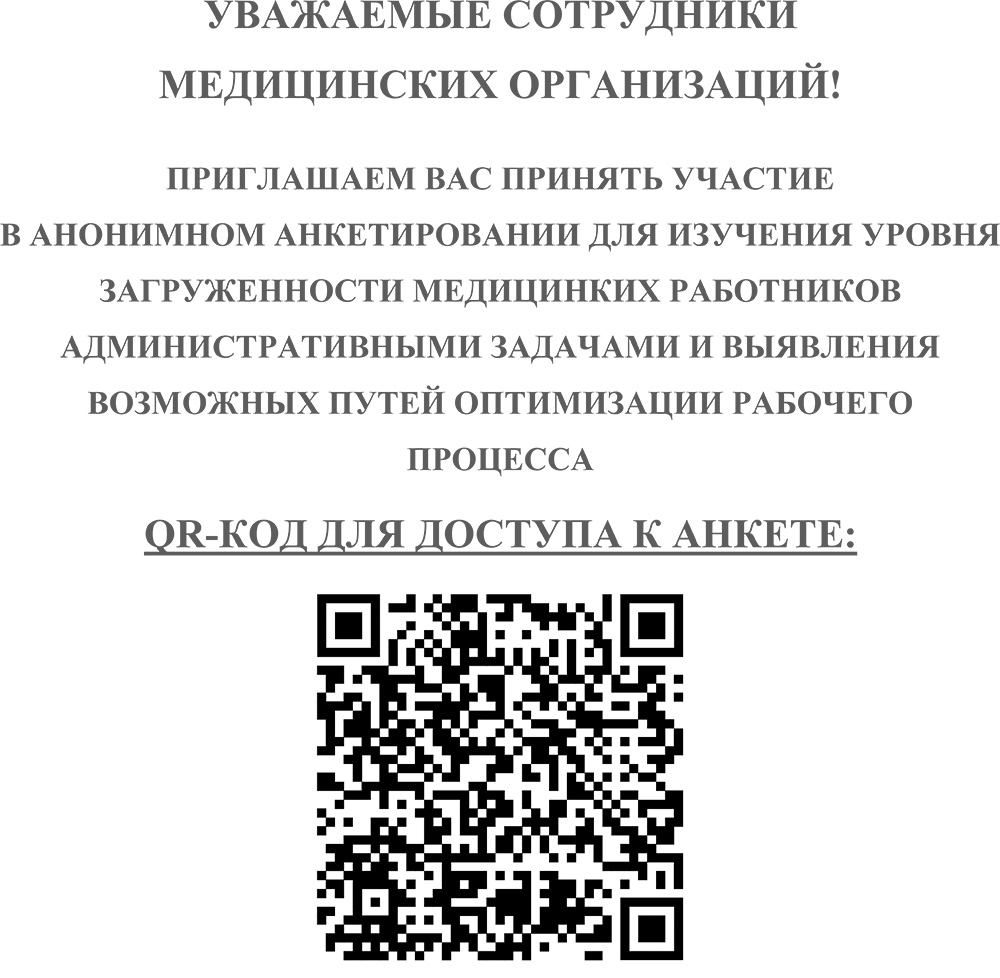ПРИГЛАШАЕМ ВАС ПРИНЯТЬ УЧАСТИЕ В АНОНИМНОМ АНКЕТИРОВАНИИ ДЛЯ ИЗУЧЕНИЯ УРОВНЯ ЗАГРУЖЕННОСТИ МЕДИЦИНКИХ РАБОТНИКОВ АДМИНИСТРАТИВНЫМИ ЗАДАЧАМИ И ВЫЯВЛЕНИЯ ВОЗМОЖНЫХ ПУТЕЙ ОПТИМИЗАЦИИ РАБОЧЕГО ПРОЦЕССА по ссылке: https://forms.yandex.ru/u/68c26409068ff02ca509a1c8